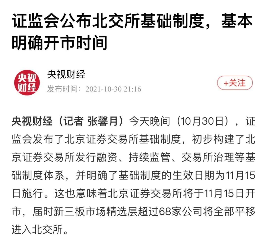 还有就是北交所的开市30日晚北交所主要制度规则正式发布11月15日起施行有券商的新三板研究人士表示可能预示着北交所也有望在今年11月正式开市 央视财经报道称届时新三板市场精选层超过68家公司将全部平移进入北交所 那么如何分析上述消息.