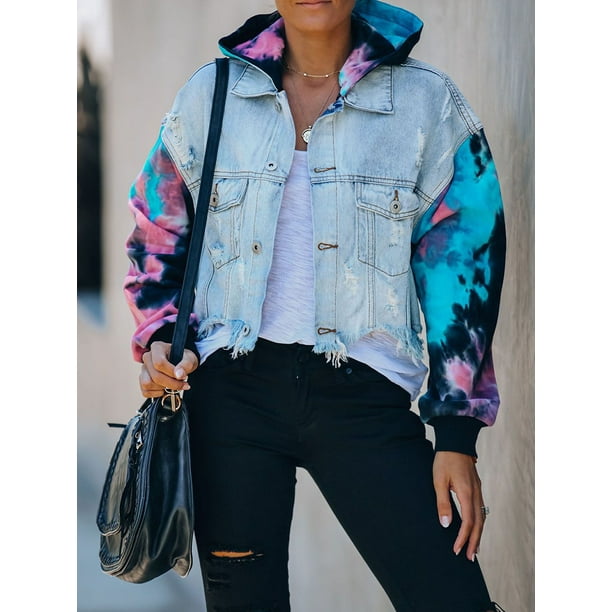 9Women Denim Jacket Color Matching Tie Dye Denim with Hole Tassel Denim Jacket Women Jacket Plus Size. Browse our mens jean jacket collection for countless variations on this cool classic with tie-dye color-block bleach effect distressed hooded and faux fur or borg collar designs to keep your denim looking fresh.
